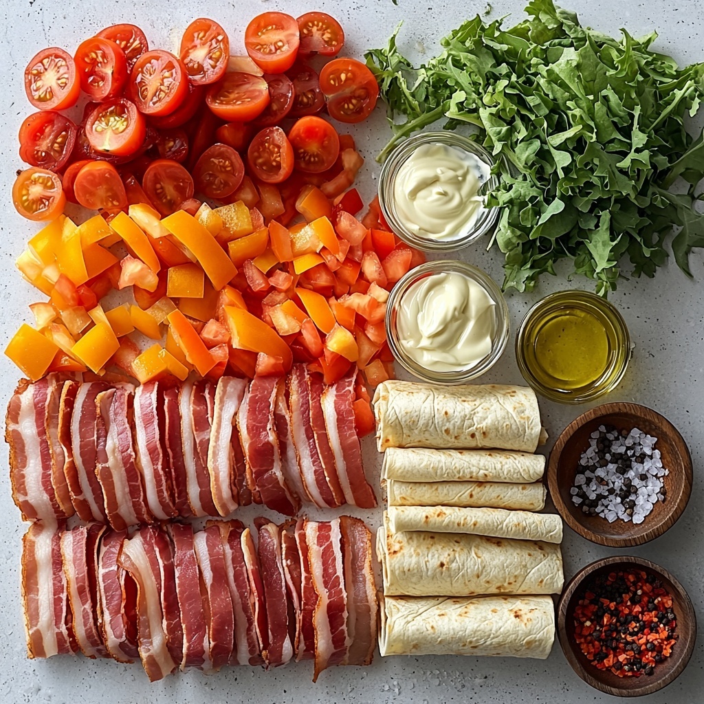 Gathering the ingredients for this BLT Wraps with Secret Sauce Recipe is a breeze because it relies on simple, quality components that each play a vital role. From the smoky bacon adding crunch and savoriness to the vibrant tomatoes bringing juicy sweetness, every ingredient enhances the overall taste and texture.