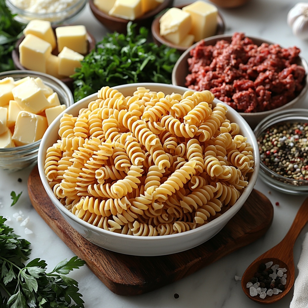 - 8 ounces Rotini Pasta: The spirals are perfect for trapping creamy sauce and bits of beef, but penne or fusilli work well too.