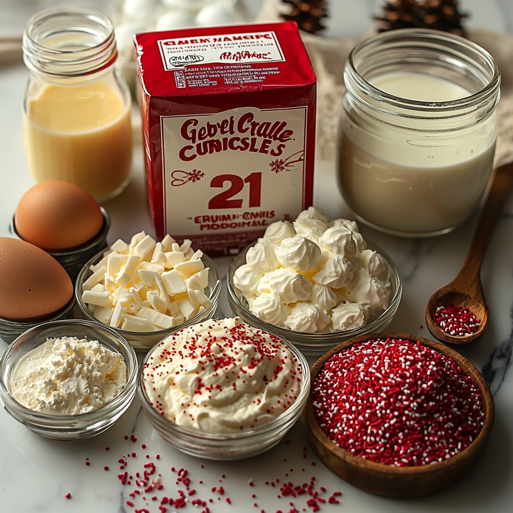 • Optional white chocolate curls or crushed peppermint: These extras make your cake look stunning and add delightful holiday flavors.
