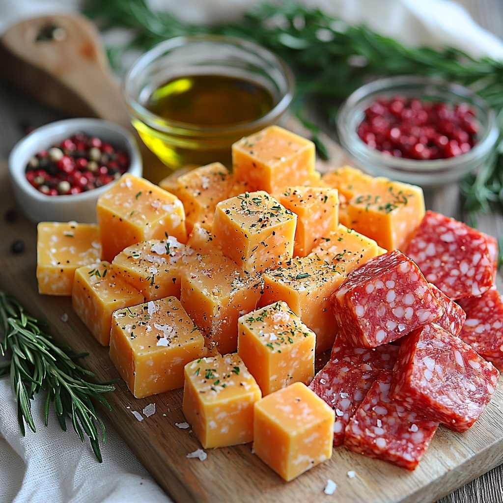 Start by placing your cubes of sharp cheddar and Monterey Jack (or mozzarella) cheese into a large bowl or a shallow dish. Add the bite-sized pieces or folded slices of hard salami, along with your baby dill pickles or whole cornichons. This mix is the foundation of your appetizer, where diverse textures and flavors begin their marriage.