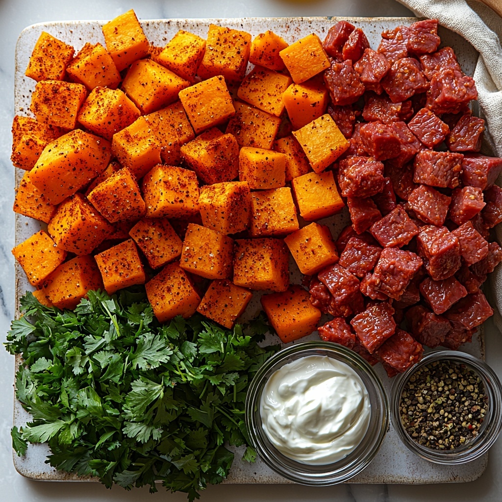 The secret to this recipe’s incredible taste lies in its simple yet thoughtfully chosen ingredients. Each one plays a crucial role, from the savory ground beef bringing rich protein, to the sweet potatoes adding natural sweetness and a satisfying bite, while spices and herbs layer in warmth and freshness.
