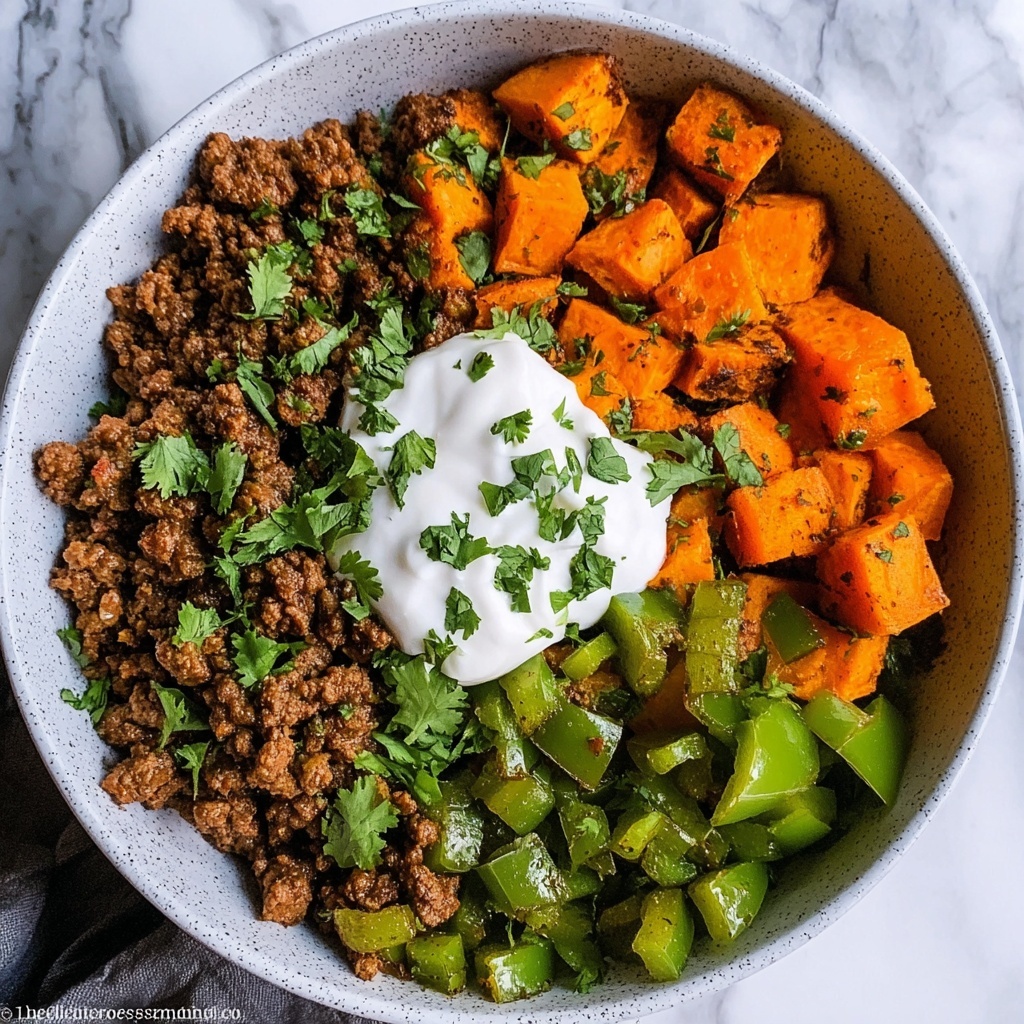 Now for the fun part! Start with a base of those golden roasted sweet potatoes, layer on the smoky bell peppers, and pile on the flavorful ground beef. Finish with a generous scoop of creamy Greek yogurt right in the center and sprinkle fresh chopped cilantro or parsley on top. The combination of creamy, crispy, and savory elements is what makes this bowl a power-packed delight.