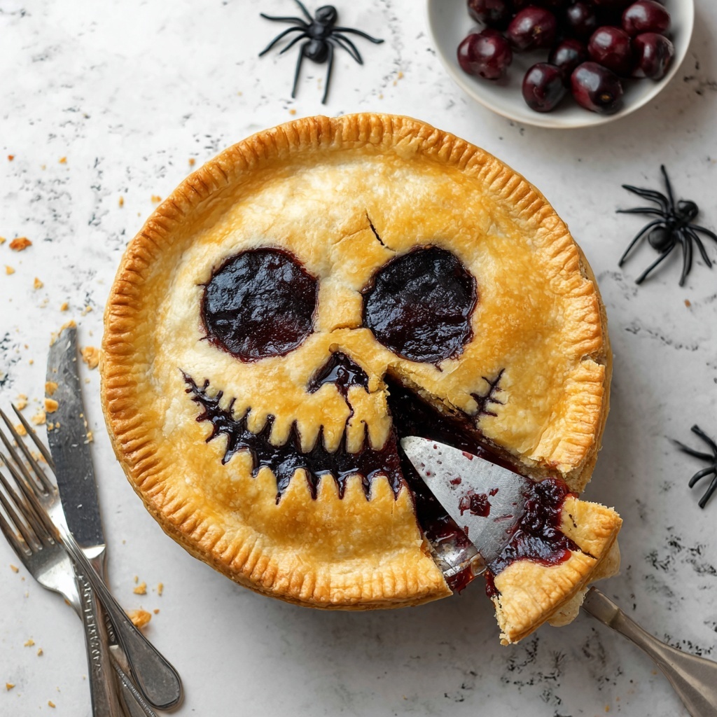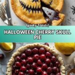 This spooky Halloween Pie features a sweet and tangy cherry filling encased in a flaky double crust with a fun skull face cutout on top. Perfect for festive fall celebrations, this cherry pie combines the warmth of cinnamon with the brightness of lemon juice for a deliciously eerie dessert.