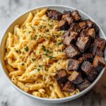 Make your presentation pop by serving in shallow, wide bowls to showcase the steak tips atop the cheesy penne. A drizzle of olive oil and a few extra shavings of Parmesan on top add a professional touch. For a fun twist, you could even serve individual portions in small ramekins for a dinner party that wows your guests.