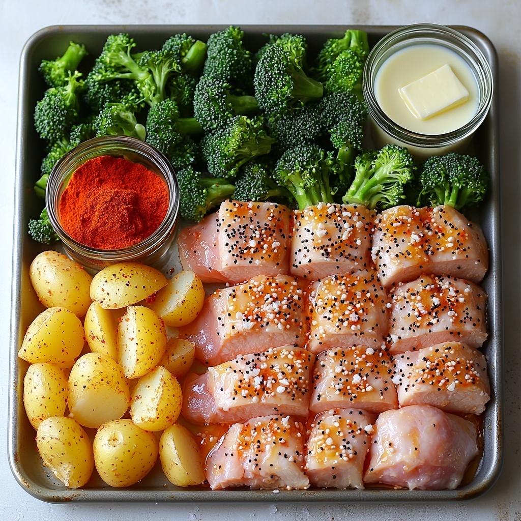 Start by preheating your oven to 375°F. This moderate temperature ensures the chicken cooks through gently while the potatoes and broccoli get perfectly crispy and tender. A well-preheated oven is crucial here to lock in flavors and achieve that wonderful golden finish on your sheet pan dinner.