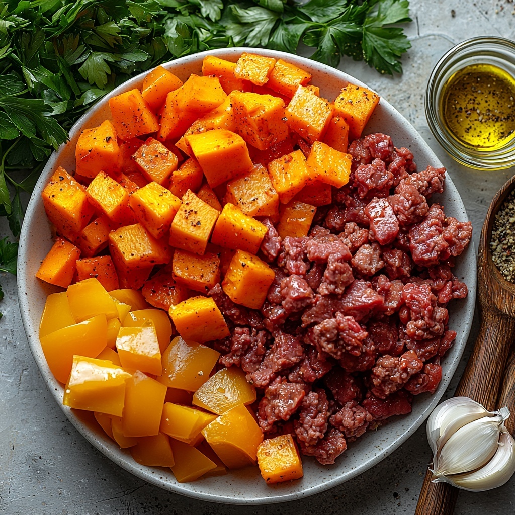 Now it’s time to fold in the diced sweet potatoes. Sprinkle in the ground cumin and smoked paprika, and season with salt and pepper. These spices bring warmth and smokiness, perfectly complementing the natural sweetness of the potatoes and the savory beef.