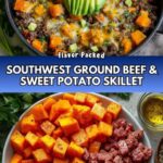 A hearty and flavorful Southwest Ground Beef and Sweet Potato Skillet that combines lean ground beef, sweet potatoes, and vibrant bell peppers with smoky spices for a quick and nutritious meal perfect for weeknight dinners.